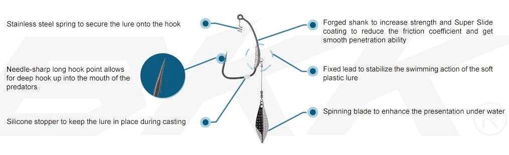 The BKK Titan Diver is the new, upgraded version of the BKK Titan Rider, designed for weedless-style rigging of larger plastics. It features all the characteristics of the original Titan Rider – a locking spring to secure the plastic lure, a silicone stopper to keep it in place and the Super Slide coating – boosted by the addition of a fixed lead to take the fishing action deeper in the water, scouting sunken structures where predator fish may dwell. The lead in turn features a stainless-steel ring to allow for the attachment of a spinning blade, improving the appeal of your lure.