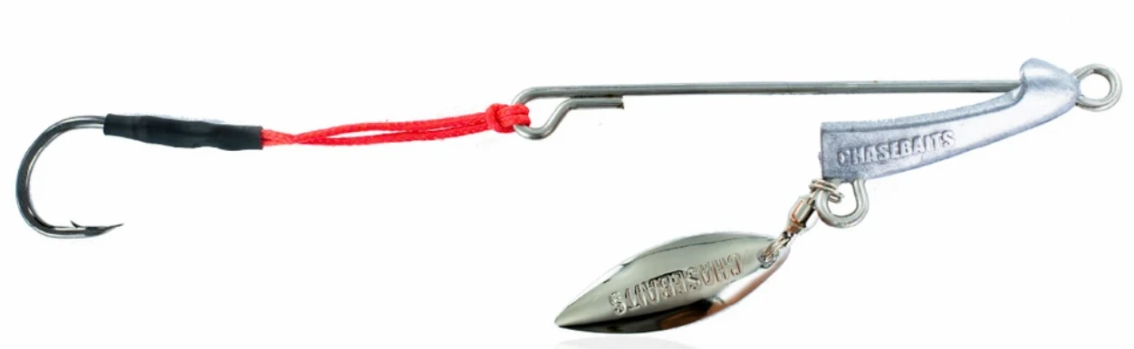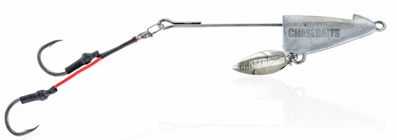 The Chasebaits Squid Rig is a rigging system for the Chasebaits The Ultimate Squid. Available in a range of sizes to match the different sizes of The Ultimate Squid, all include the molded weight jig head, strong and sharp 4/0 twin assist hooks, and a custom Willow blade. Designed to sink at the perfect angle for impeccable hood wing movement and balanced action. The twin assist hooks are attached to the rig with a quick-release clip rated to 85 pounds, and the included flash blade can be replaced with a treble, stinger hook, or any other required accessory.