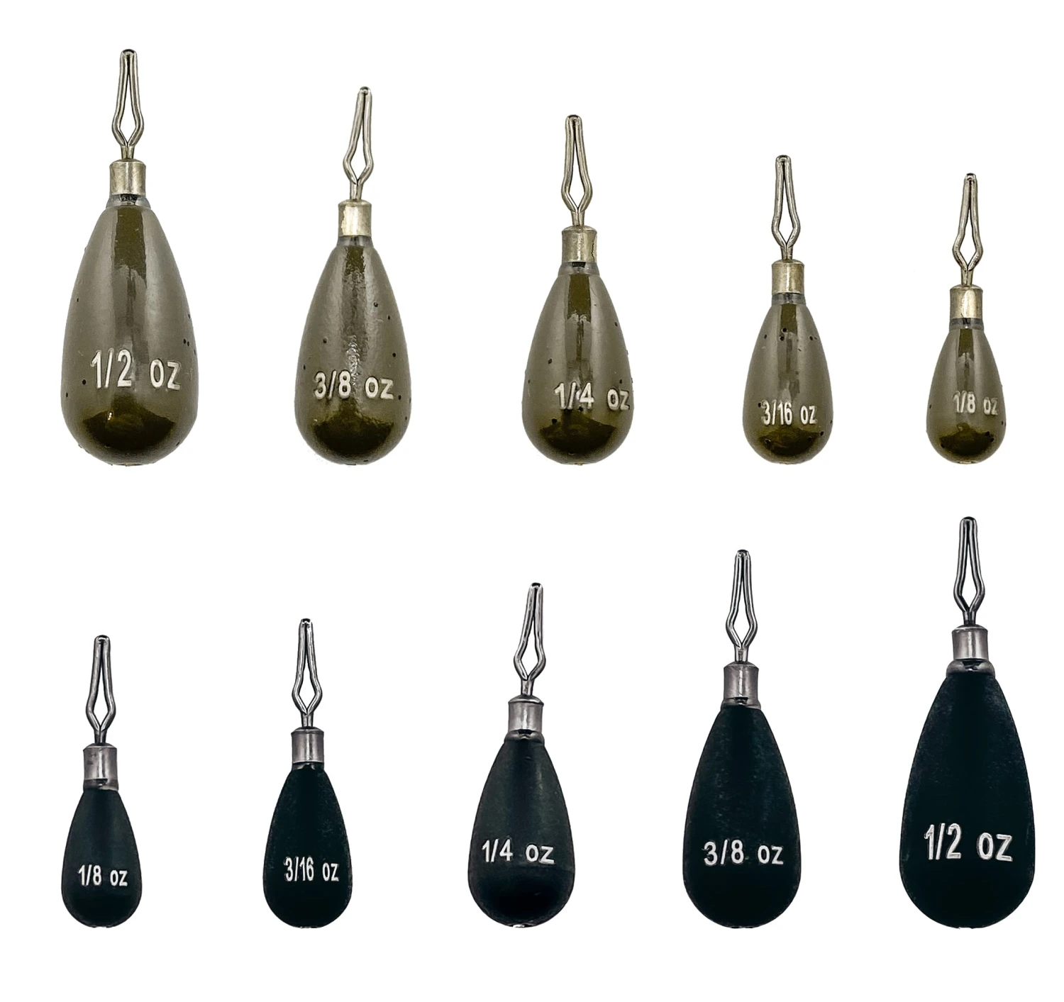 - The Departure Outdoors Tungsten Tear Drop Shot Weights come in sizes from 1/8 to 1/2 oz, 5 weights per pack.