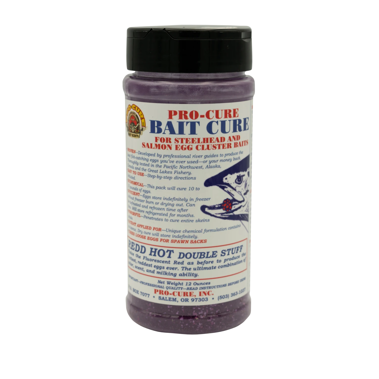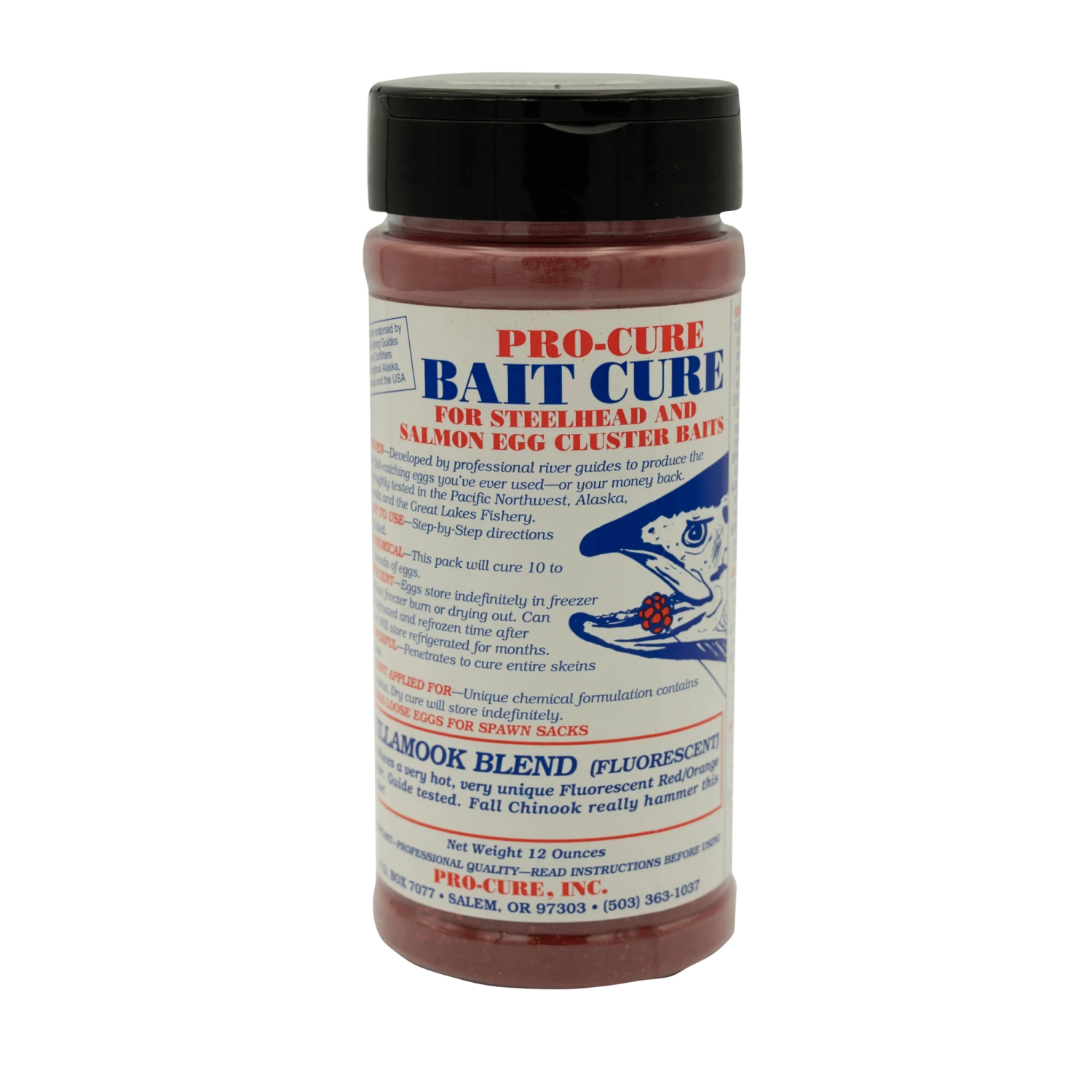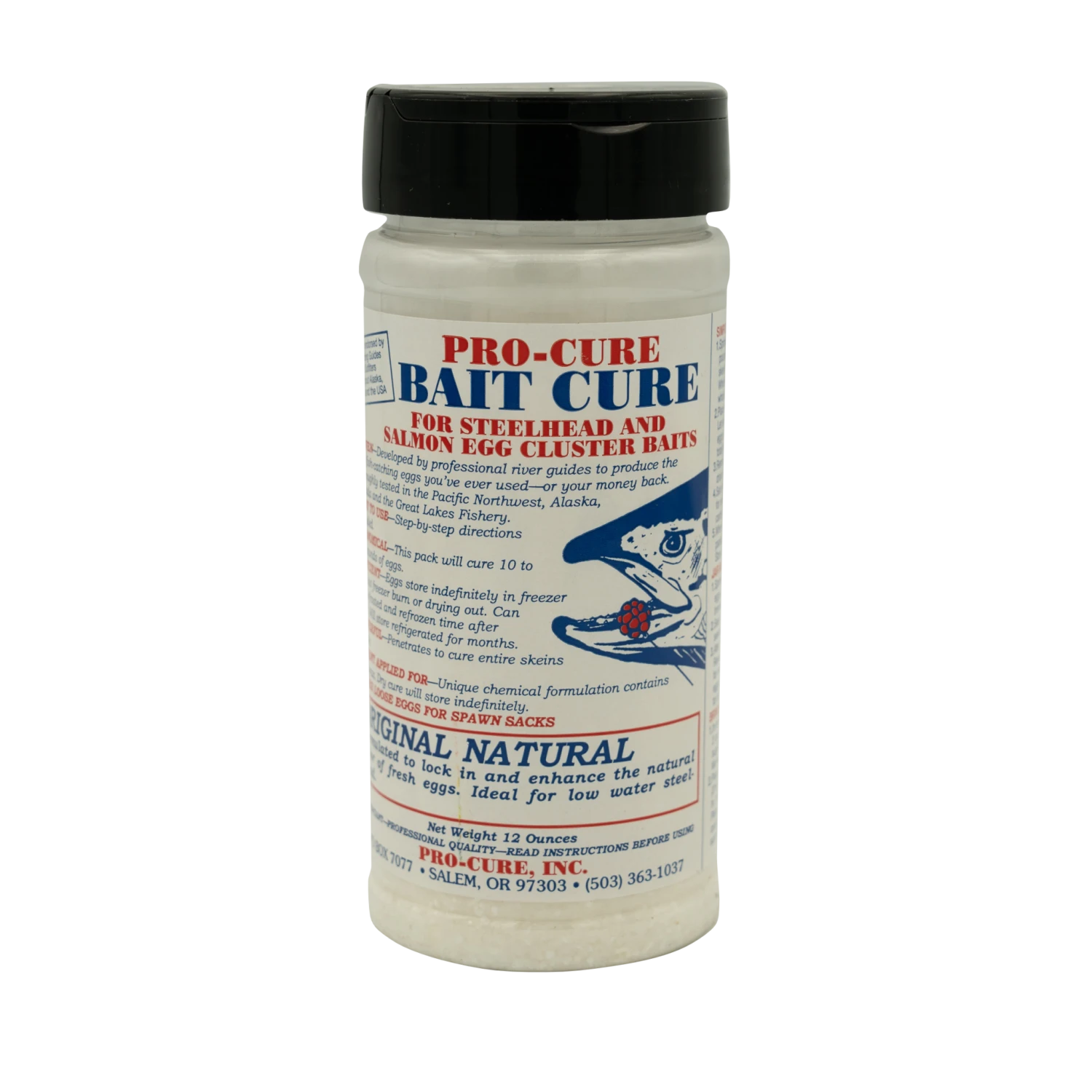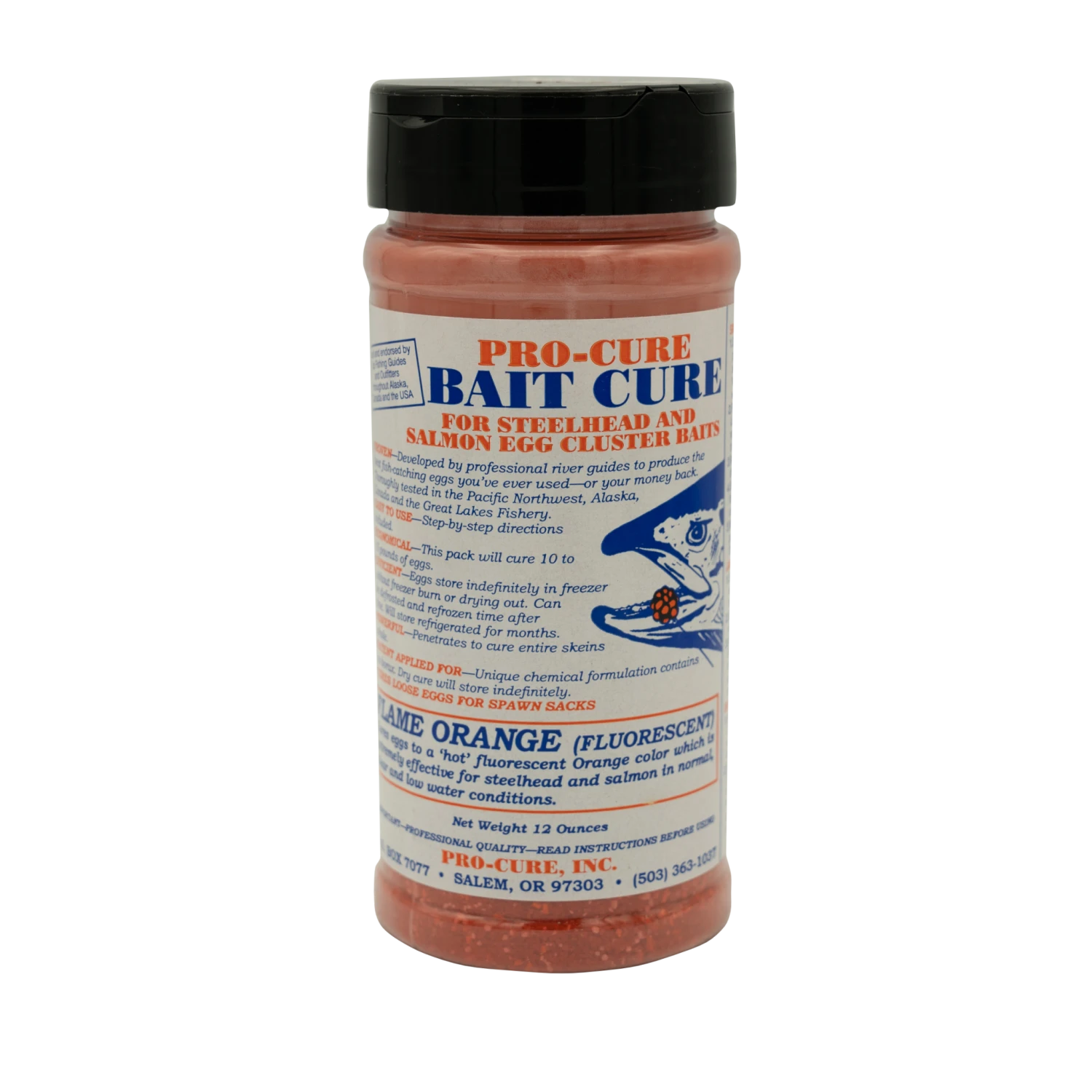- Pro-Cure Bait Cures are 12 ounce bottles of bait curing powder for curing salmon eggs, each blend has its own advantages for different conditions and species.Â
